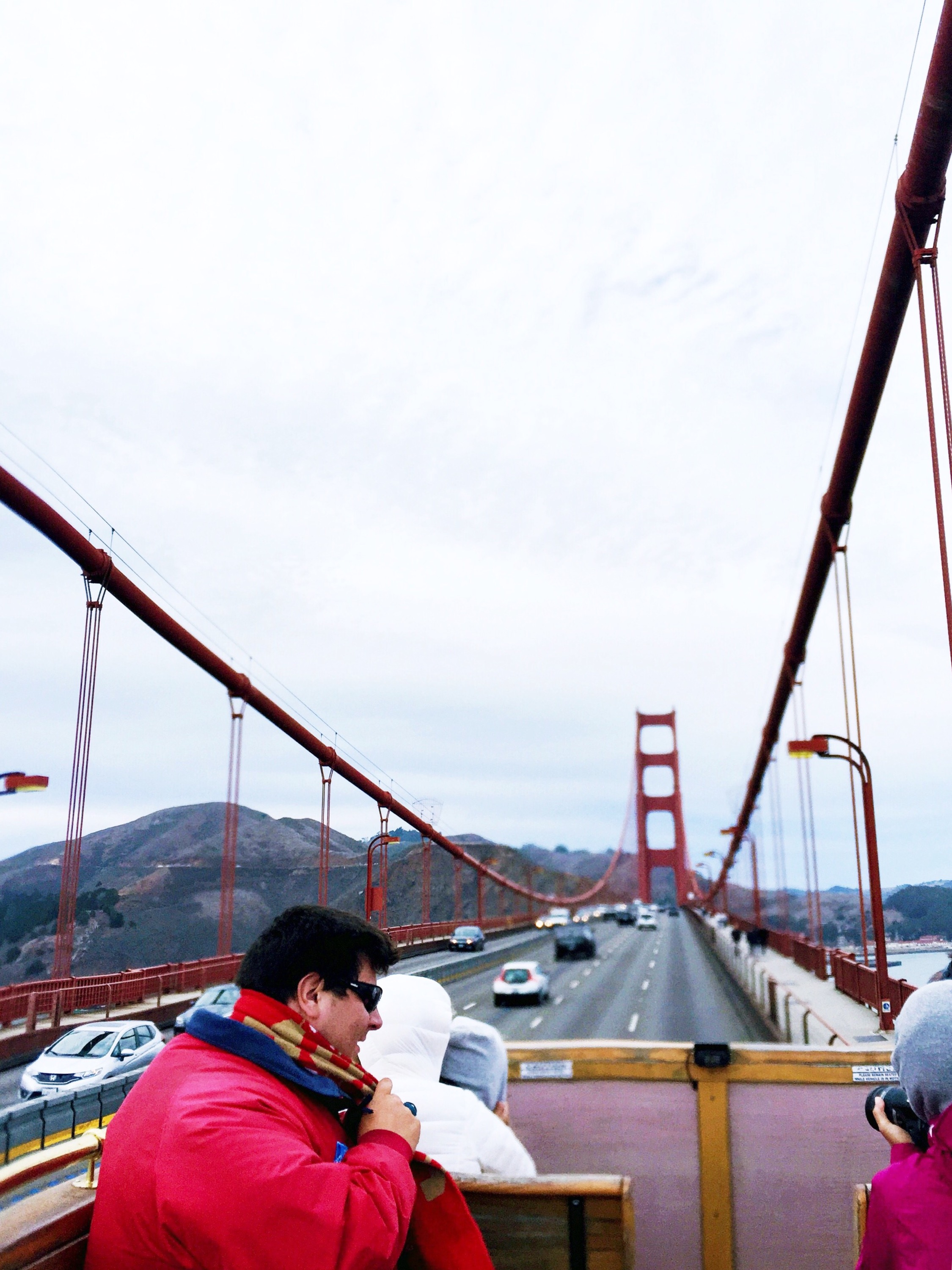 巴士駛上金門大橋,隔著車窗依然能聽見陣陣風聲,冷風無所不用其極的往車內亂竄。