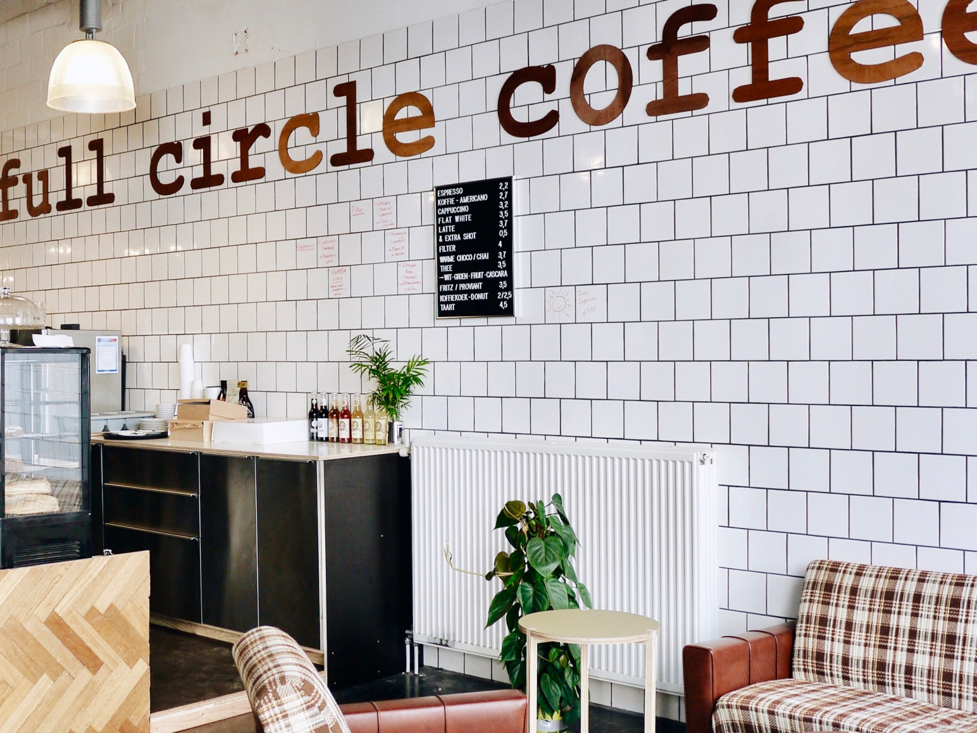 室內空間方正寬敞,前後都是大片大片的落地窗,印著Full Circle Coffee的白色磁磚牆很搶眼,把爭先恐後地從窗外投入的陽光又折射了一便。磨豆機的研磨聲喀喀作響,咖啡豆的油脂所散發的香淳氣味填滿整個室內空間。有著一碗帥氣光頭的老闆也有著一抹帥氣的笑容,抬起頭給了我們一個大大的微笑,很顯然我們是今天的第一組客人。