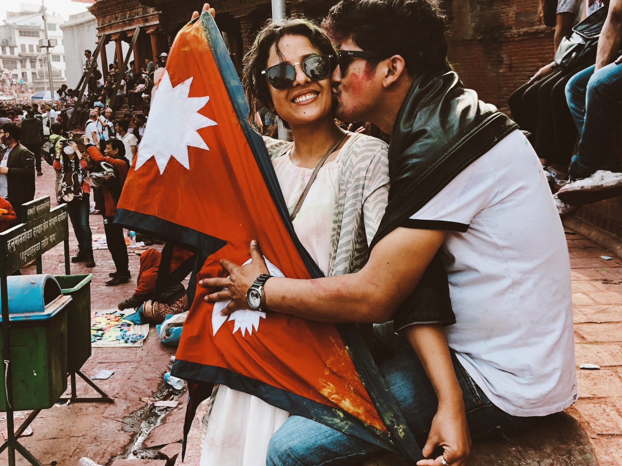 離開王宮廣場後,我們坐在一座廟宇旁的階梯上發呆,看著大街上人潮來去,每張臉都沾滿色彩,眾人的吶喊聲不曾間斷,每一個人都有自己獨特的慶祝方式,比如對面的小哥自備了藍牙音響在廟前當DJ;比如右前方的大叔揮舞著旗杆上的尼泊爾國旗高喊:「我愛尼泊爾!Happy Holi!」;比如來自國外的攝影團人手一台大砲相機,在我身後狂按快門。